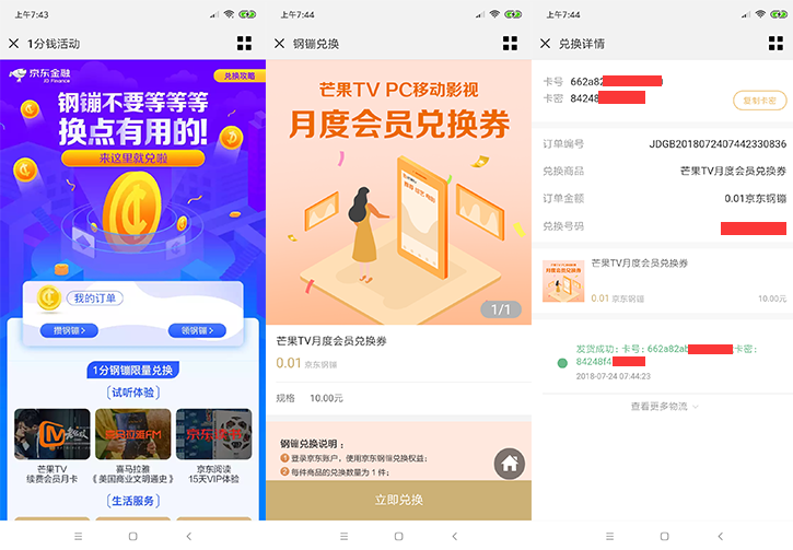 1、微信扫码进入→登陆京东→芒果TV会员月卡→使用0.01京东钢镚兑换→复制卡密充值即可