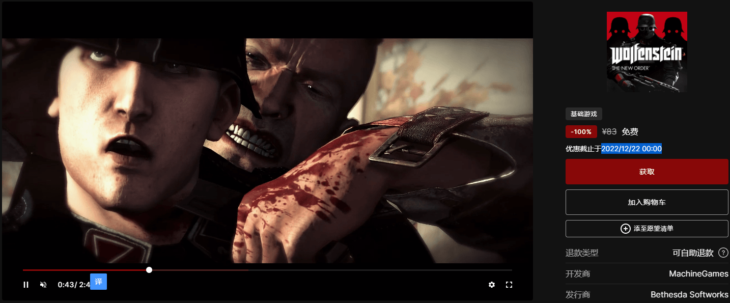 《德军总部:新秩序》是一款第一人称射击类型的游戏系列。作为一个虚构故事将背景设定在 20 世纪 60 年代的平行世界。名字、角色、 组织、地点和事件均为想象或虚构。该游戏的故事内容无意且绝不应被认为是纵容、美化或支持纳粹政权的信仰、意识形态、 事件、行为和个人,或忽视其战争罪行、种族大屠杀和其他反人类罪行。 领取地址:https://store.epicgames.com/zh-CN/p/wolfenstein-the-new-order 活动时间:2022/12/22 00:00 |