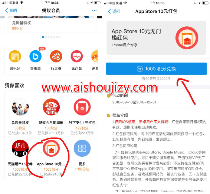 活动入口:支付宝APP-我的-蚂蚁会员- 往下拉1000积分可兑换10元无门槛红包