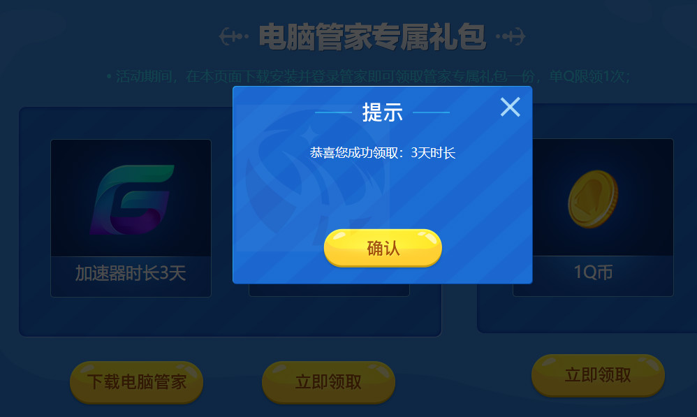 进去活动页面下载电脑管家,亲测领3天会员+1Q币