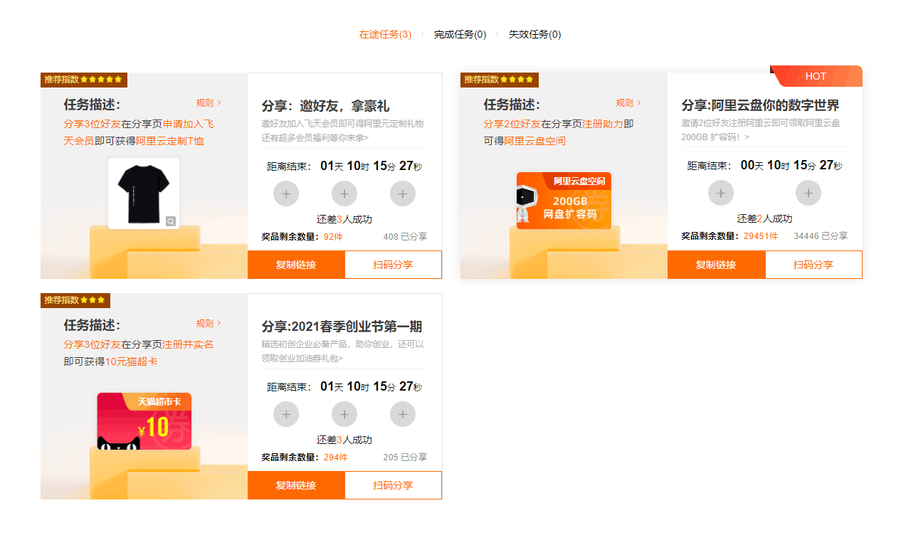 阿里云好友助力领T桖、阿里云盘200G、10元超市卡等等等