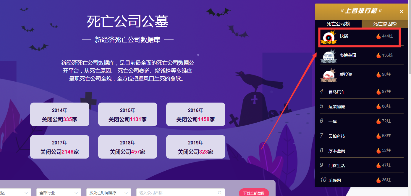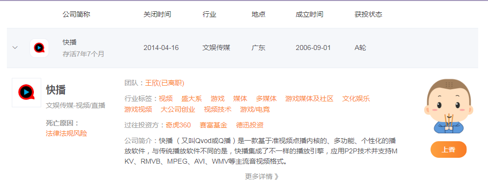 看了烧香榜,瞬间感觉欠快播一个会员。 新经济死亡公司数据库,是目前最全面的死亡公司数据公开平台; 从死亡原因、 死亡公司赛道、烧钱榜等多维度呈现死亡公司全貌, 全方位把握风口生死的命脉。 一些想要做投资,做一些 p2p 平台等可以看看死亡公司数据库; 有不少大型公司的死亡原因、死亡时间等可以起到一定的参考作用。 该网站还能为这些倒闭公司上香(快播果然香),上香需要注册登录。 |