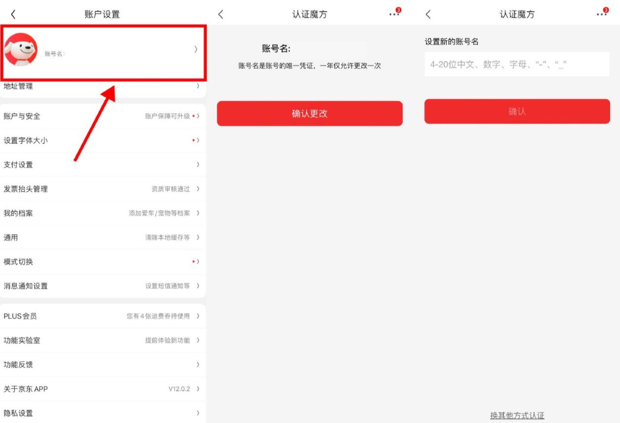京东APP->我的->右上角设置->点击头像进入->验证一下就能修改账号名了