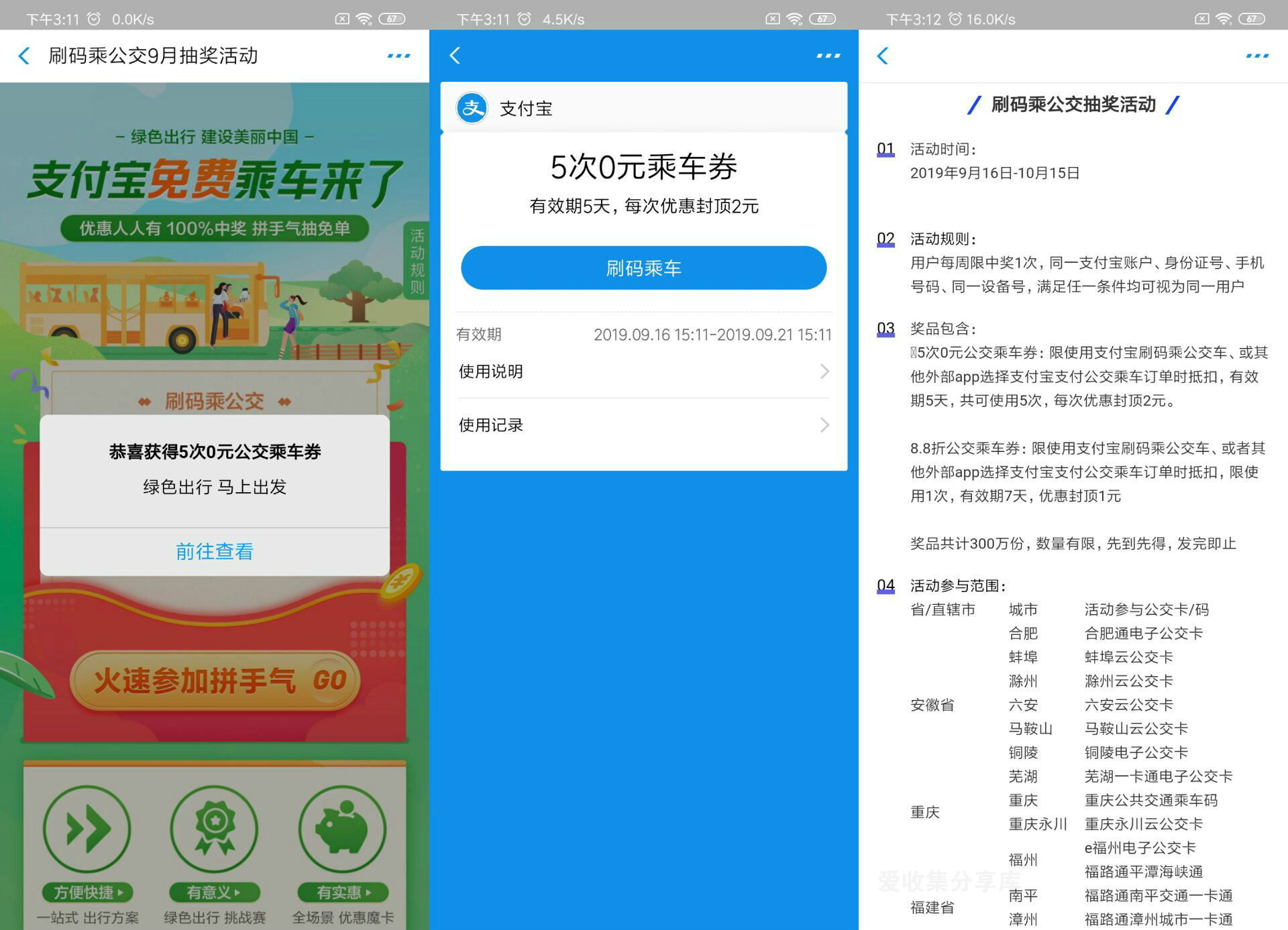 支付宝扫码抽公交乘车券
