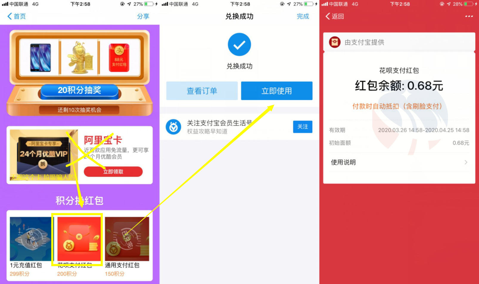 下拉直接兑换0.68元花呗红包,可以小号套出!