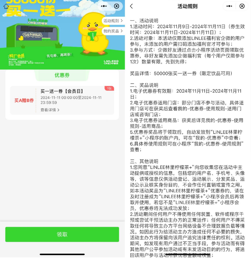 微信扫码参与->直接领买一送一券,限量5万份 仅限11月11日可用