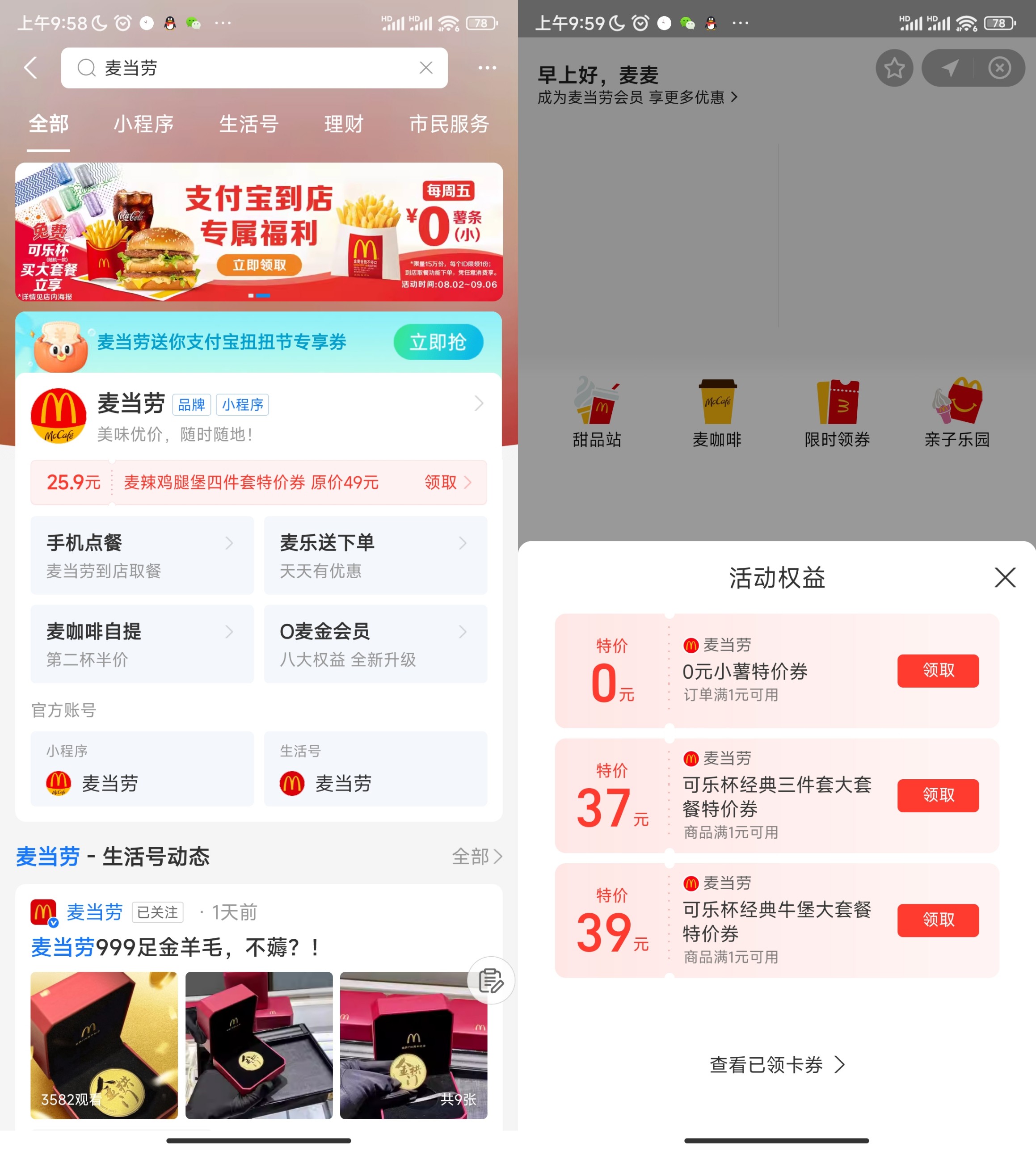 支付宝搜索“麦当劳”->点击横幅进入->直接领0元薯条券,