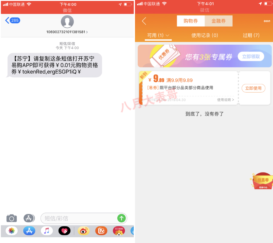 活动步骤: 1.打开微信扫码进入,输入手机号领取 2.下载苏宁易购app,用刚才手机号登录 3.复制短信全文,打开苏宁app弹窗领取 4.直接选择9.9专区购买,支付0.01元~ PS:这次活动无需实名!无需实名!手机号多可换号多撸! 活动地址:http://t.cn/E2oM2hQ