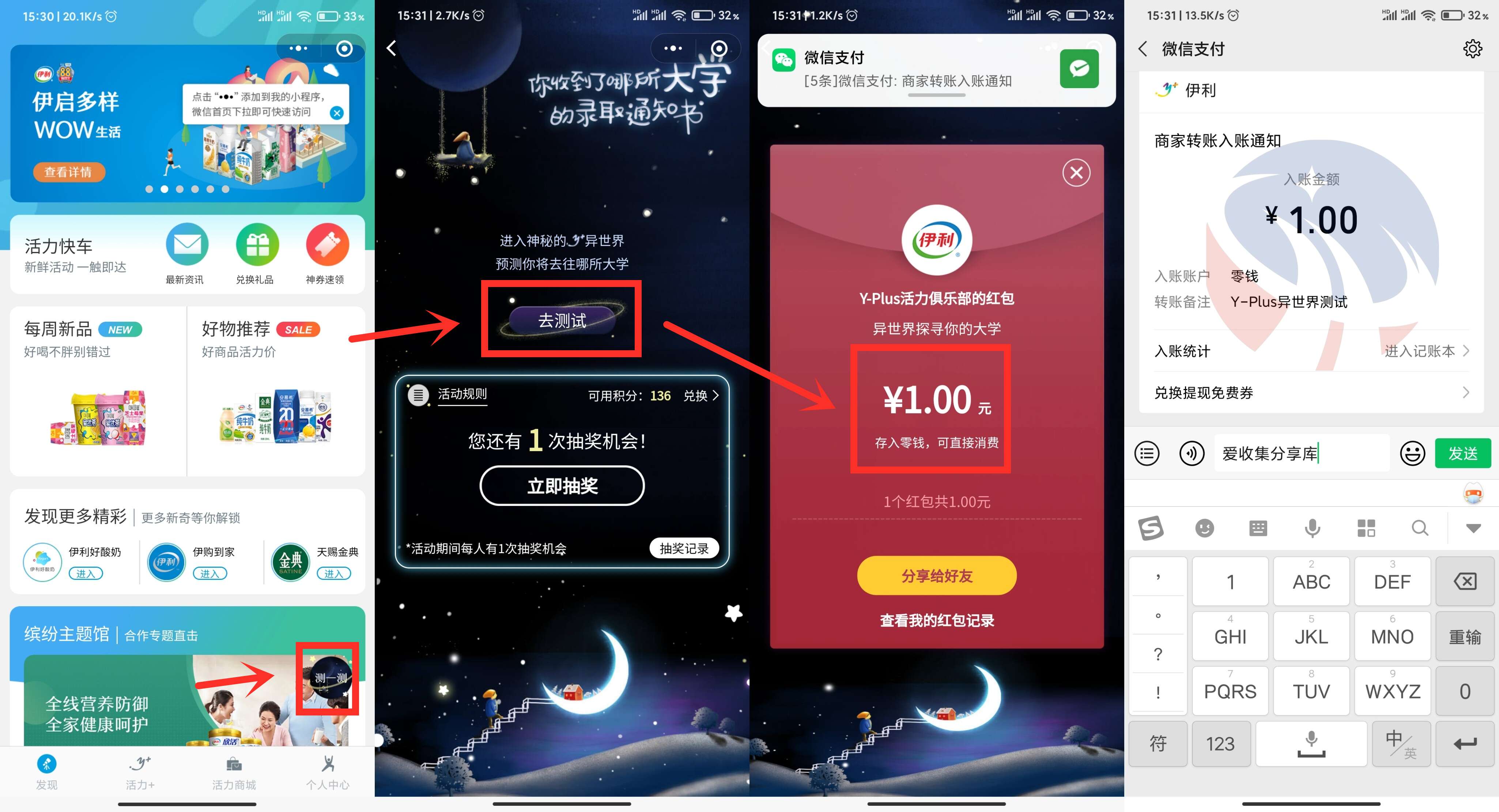 2、右下角测一测->根据提示获得机会->亲测1元微信红包非必中!