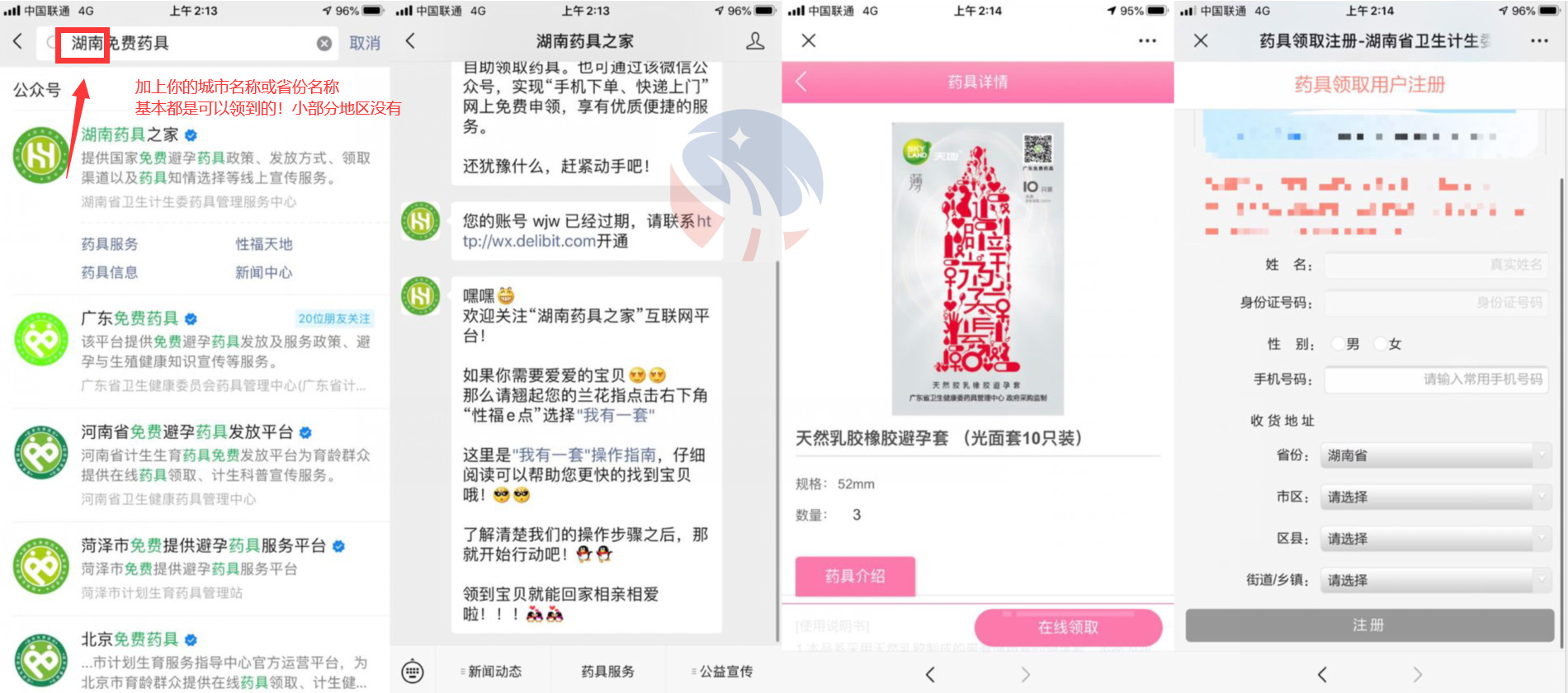 1、微信公众号:“免费药具” 免费药具前面加上你所在的省