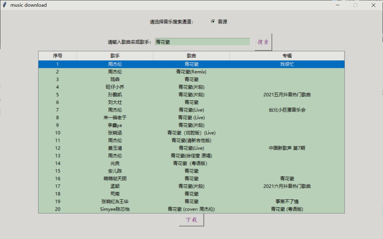 说明: 本软件是用py写的一个简单的音乐下载工具,为方便下载音乐使用, 为体现功能性所以起名叫做music download, 软件介绍: 用的tk模块做的显示界面,很简单,只有音乐搜索、显示列表及下载, 软件所用的音源API并非无损音质,所以对音质有要求的小伙伴就选择其他的下载器即可。 经打包后软件大小为16M。 软件第一次使用下载,会在exe同级目录下生成一个名为music的文件夹, 下载的歌曲都保存在这里面。 源码我这里就不放出来了,实现过程很简单的一个小程序, 就不在大佬面前班门弄斧了,如果有感兴趣的小伙伴可以互相交流。 下载地址蓝奏网盘 |
