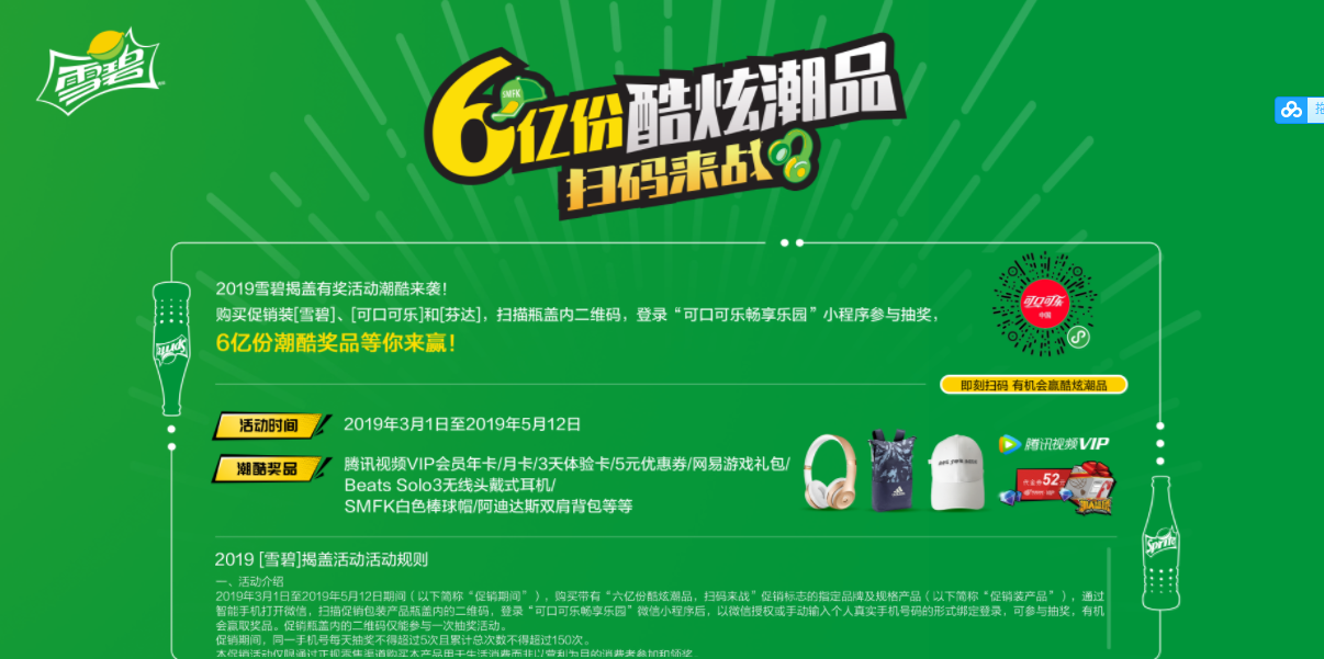 一个瓶盖可以抽一次奖励,奖励有:腾讯视频VIP会员年卡 月卡 3天体验卡 还有周边实物 某宝有卖码子的,都快炒到2元一个码子了,一瓶水才3块钱!大家可以去超市买水卖码! 活动地址:http://utc2019-campaign.sprite.com.cn/campaignsite/indexpc.html |