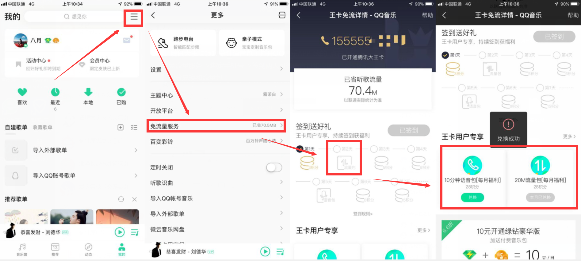打开QQ音乐APP-我的-免流量服务-兑换10分钟语音包