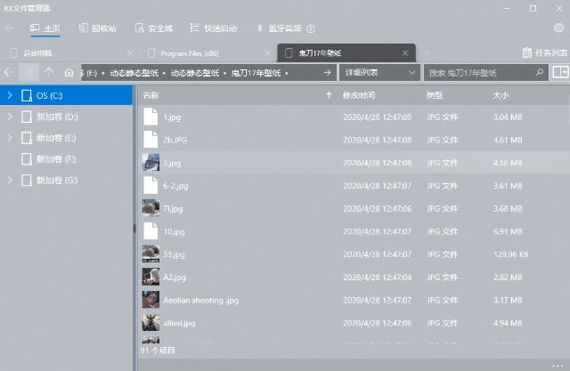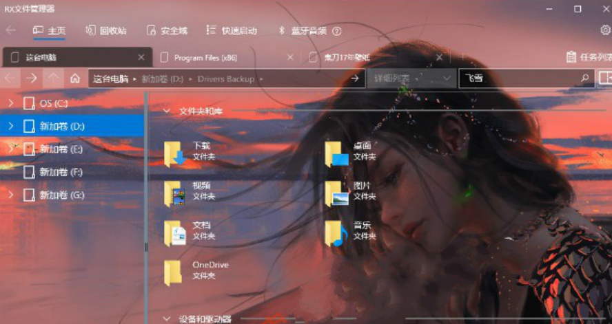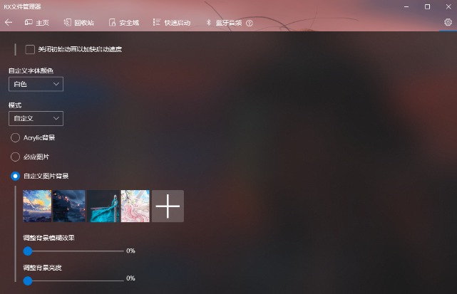 在切换的时候无疑更加方便,间接提高了工作效率。 而如果想让默认的文件管理器实现此效果,需要配合QTTabBar等软件。高下立判,RX牛逼! 自定义背景: RX默认背景色是半透明的,会时刻跟随桌面背景切换,如图所示,这个半透明灰色是不是就舒服多了图片 如果你都不喜欢,那就自定义背景图片。点开右上角设置, 可以自主更换背景图,设置字体颜色、模糊度、亮度等。 看看成品效果,是不是很惊艳: Everything搜索:
