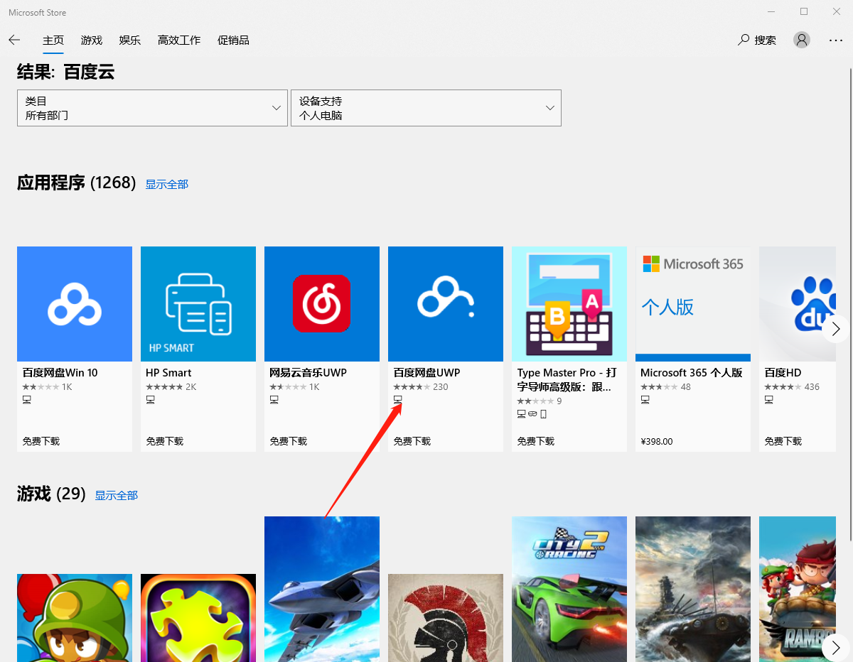 1、在WIN10应用商店搜“百度网盘UWP”;