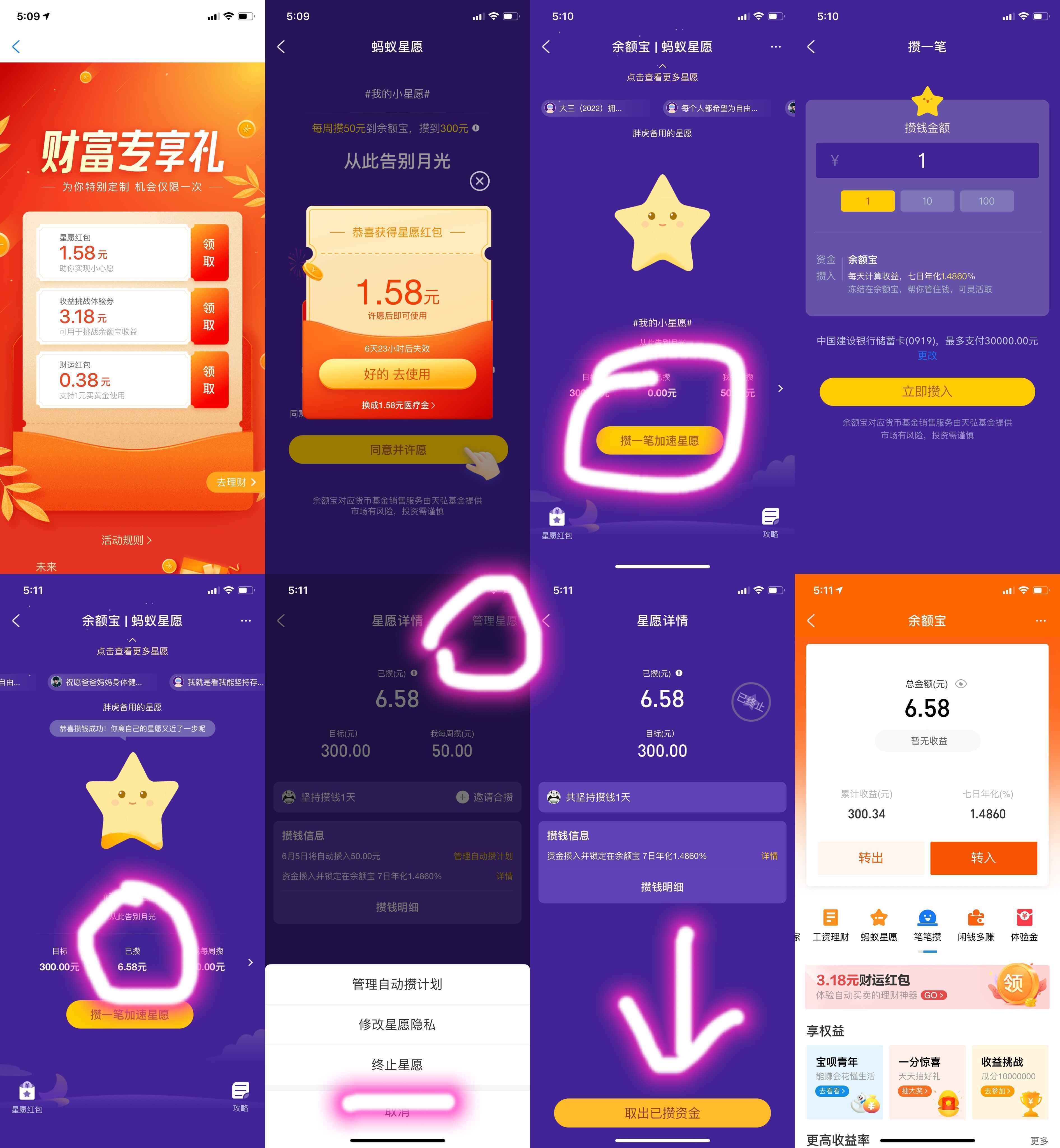 1、支付宝->扫码->有出现1.58元星愿红包就领取->没出现就做不了->去许愿->开通心愿->攒入第一笔