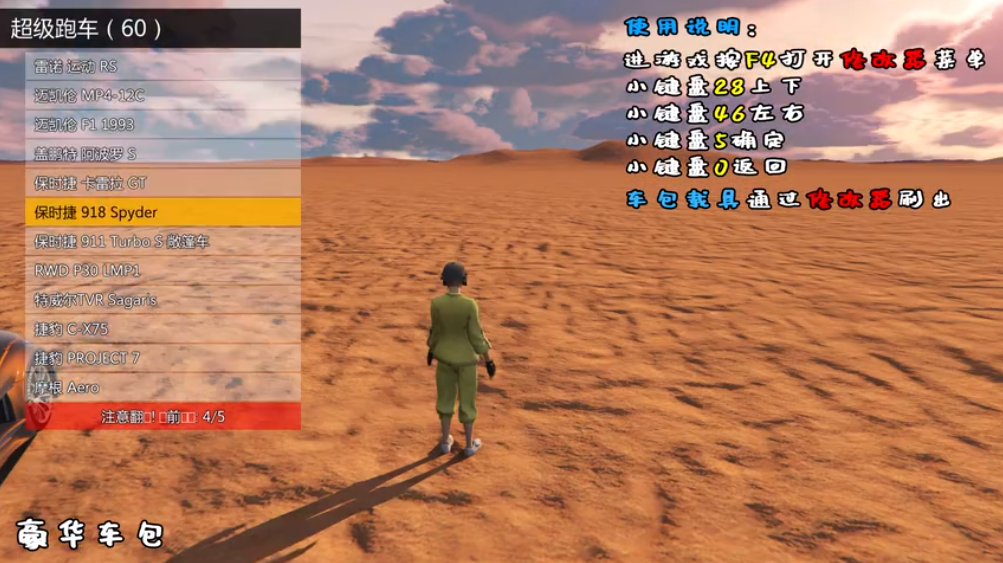 豪华车包 使用说明: 进游戏按F4打开修改器菜单 小键盘2846上下左右 小键盘5确定