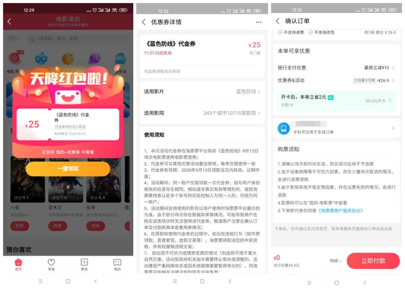 PS:支付宝里没有弹窗就下载淘票票APP看有没,券只限今天!