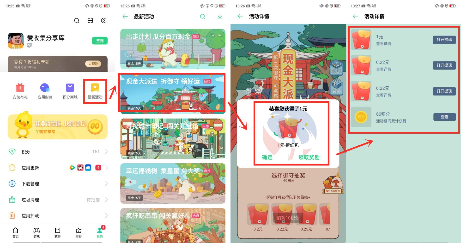 2、进去抽红包->我中了1元多->没积分了返回最新活动