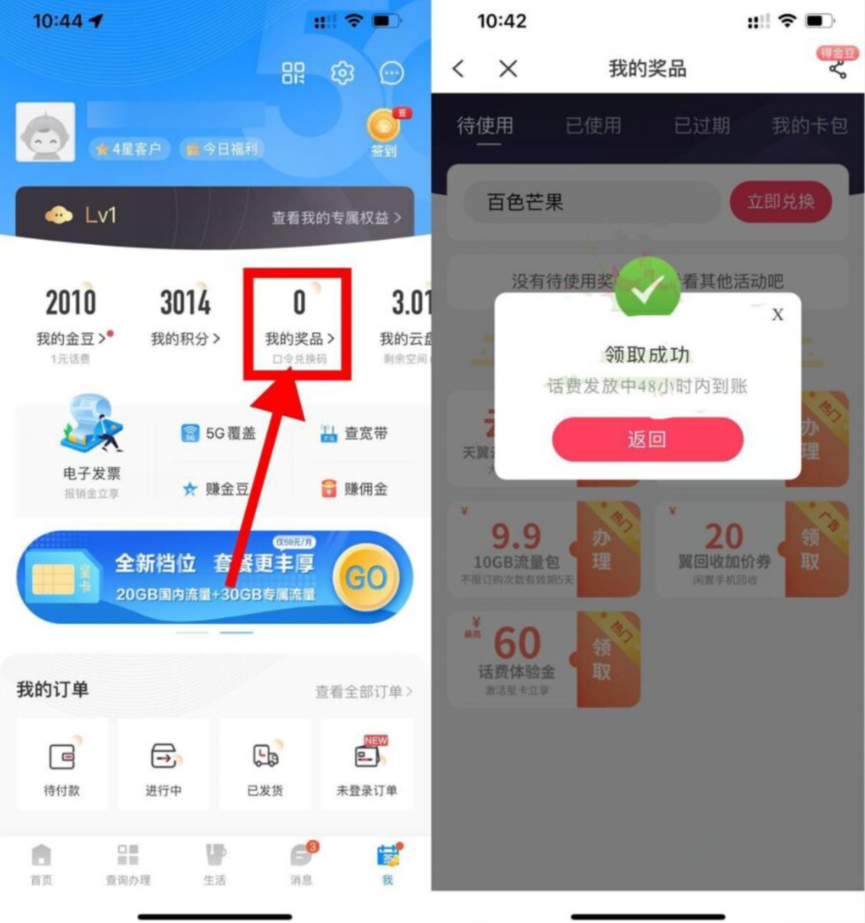 电信APP->我的->我的奖品->输入对应省份的囗令抽话费