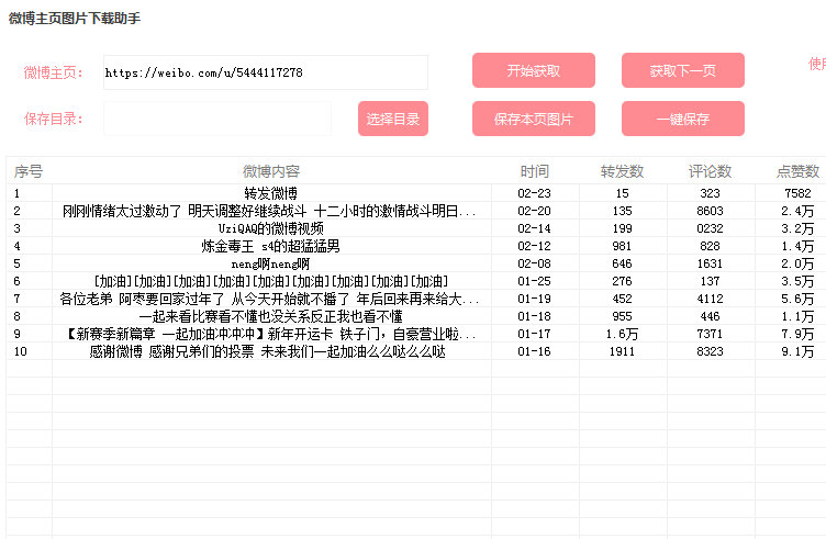 微博图下载助手能够帮助大家无需登录微博,下载微博上面的图片 它能够一键获取博主主页的所有图片信息,支持批量全部下载 使用方法: 1.输入微博主页链接。 2.点击开始获取、 3.选择保存目录。 4.点击一键保存。