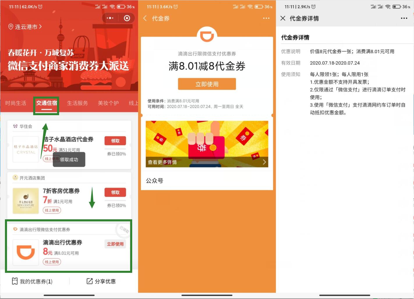 2、左滑点->交通住宿->下拉页面领取6元滴滴打车券