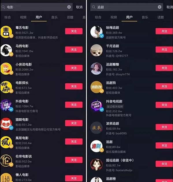 你在短视频平台刷过剧或者看过电影解说吗? 在抖音等短视频平台,我们以“电影”“追剧”类似的关键词搜索, 搜到的账户有几百上千个,单个账号粉丝最多的有5600多万。 这些账号的营销模式很成熟,基本都是通过对影视剧片段进行剪辑,