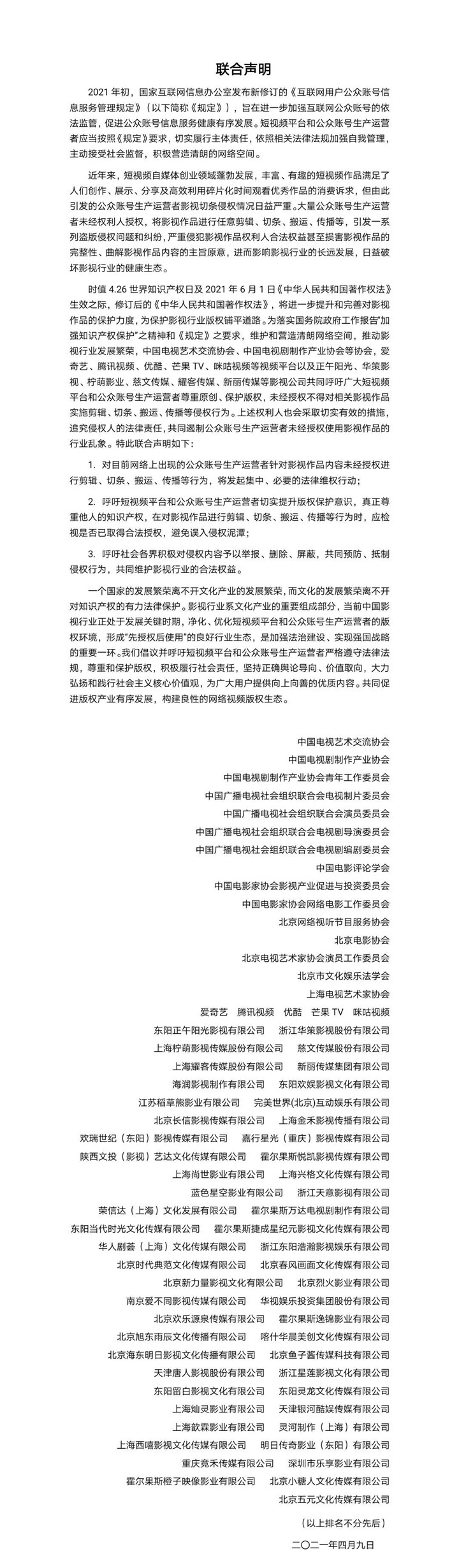 配以解说,将一部两小时的电影精简为一个或是几个短视频片段。 除了短视频平台,B站也有很多类似的剪辑解说。 4月9日,优爱腾(优酷爱奇艺腾讯)和各大影视公司发布联合声明,表示对目前 网络上出现的影视作品内容未经授权进行剪辑、切条、搬运、传播等行为进行维权。 小编数了数,联合声明的发布方一共有73家单位!其中包括优酷、爱奇艺、 腾讯视频、芒果、咪咕5大视频网站,15家影视行业协会, 还有55家影视综制作和发行的传媒公司。 好家伙,这足够顶起影视界的半边天了!声明一出。。