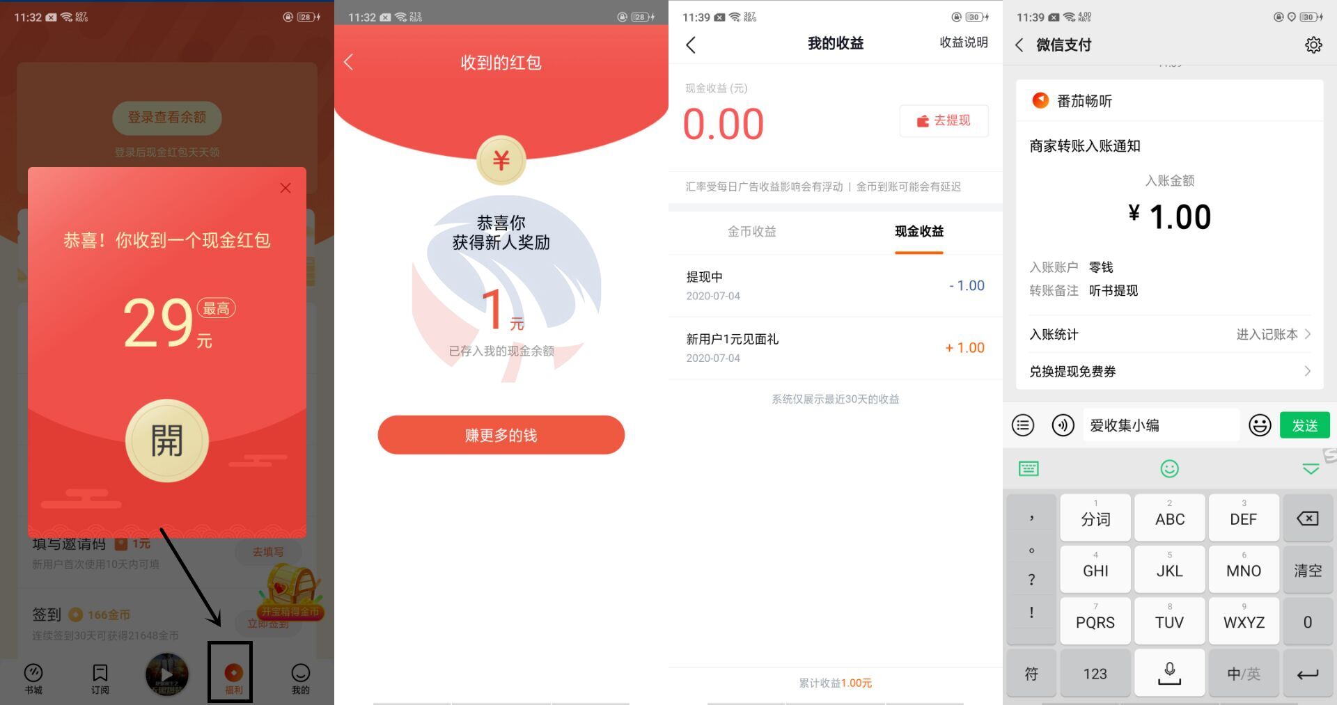 2、打开后点底部福利->手机注册领取1元后->听书5分钟