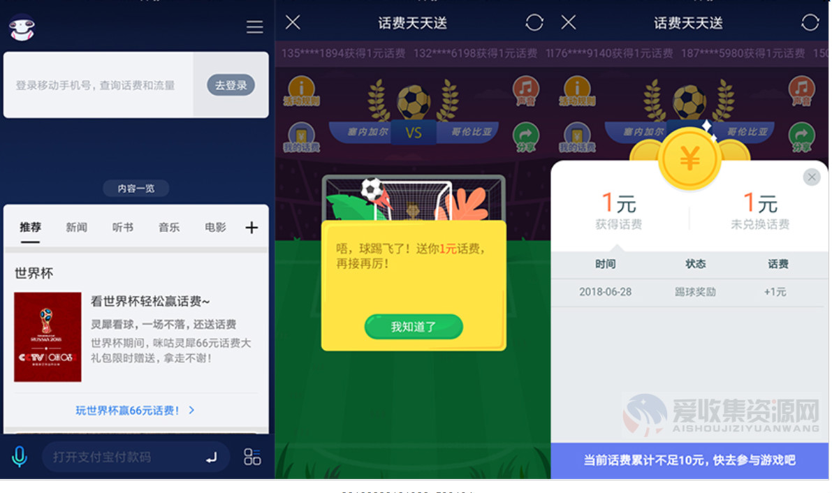 活动提示: 1、下载打开咪咕灵犀,首页点击语音说:“踢足球” 2、然后自动跳转到话费天天送页面,随意点击足球踢飞。 3、得到1元话费,话费满10元可兑换,每天可领1元,10天就10块钱话费了~ 咪咕灵犀:http://sj.qq.com/myapp/detail.htm?apkName=com.iflytek.cmcc