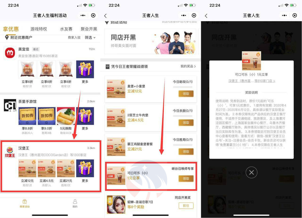 2、微信登陆下滑找到汉堡王->进去领取1元可乐