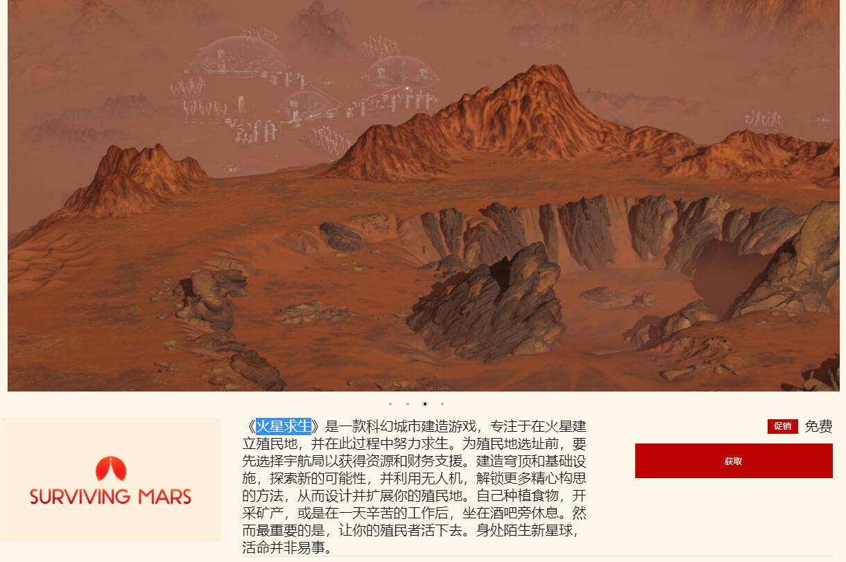 10月11日补充新地址,原价29.9限时免费 《火星求生》是一款科幻城市建造游戏 专注于在火星建立殖民地,并在此过程中努力求生。 活动地址:https://www.epicgames.com/store/zh-CN/product/surviving-mars/home |